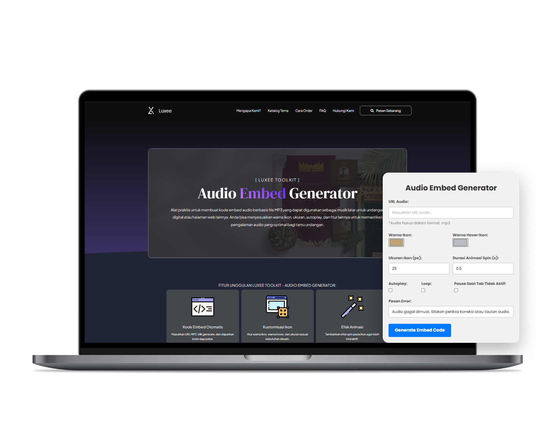 Alat praktis untuk membuat kode embed audio berbasis file MP3 yang dapat digunakan sebagai musik latar untuk undangan digital atau halaman web lainnya. Anda bisa menyesuaikan warna ikon, ukuran, autoplay, dan fitur lainnya untuk memastikan pengalaman audio yang optimal bagi tamu undangan.